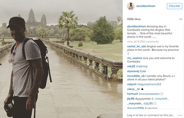 David Beckham បានមកដល់ក្រុងសៀមរាប ប្រទេសកម្ពុជា កាលពីថ្ងៃទី១៤ ខែមិថុនា ឆ្នាំ២០១៥ ក្នុងនាមឯក អគ្គរាជទូត សុច្ឆន្ទៈអង្គការយូនីសេហ្វ ដើម្បីលើកកម្ពស់សិទ្ធិកុមារ នៅកម្ពុជា ។ ក្នុងពេលបំពេញ បេសកកម្មនេះ Beckham បានទៅទស្សនា ប្រាសាទអង្គវត្តខ្មែរ ។ Beckham បាន សរសេរនៅលើ ទំព័រ Twitter របស់លោកថា «ពិតជា ថ្ងៃដ៏អស្ចារ្យ នៅកម្ពុជា ដោយបាន មកដល់តំបន់ ប្រាង្គប្រាសាទអង្គវត្ត ដែលជាទីកន្លែងដ៏ស្រស់ស្អាតបំផុតមួយ លើពិភពលោក» ។